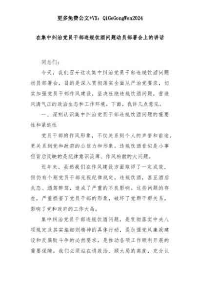 【七哥公文】2025年:【七哥公文】在集中纠治党员干部违规饮酒问题动员部署会上的讲话+更多免费公文+VX:QiGeGongWen2024+更多免费公文+VX:QiGeGongWen2024