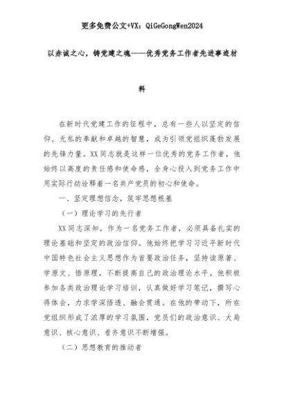 【七哥公文】2025年:【七哥公文】以赤诚之心,铸党建之魂——优秀党务工作者先进事迹材料+更多免费公文+VX:QiGeGongWen2024+更多免费公文+VX:QiGeGongWen2024