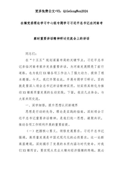 【七哥公文】2025年:【七哥公文】在镇党委理论学习中心组专题学习习近平总书记在河南考察时重要讲话精神研讨交流会上的讲话+更多免费公文+VX:QiGeGongWen2024+更多免费公文+VX:QiGeGongWen2024