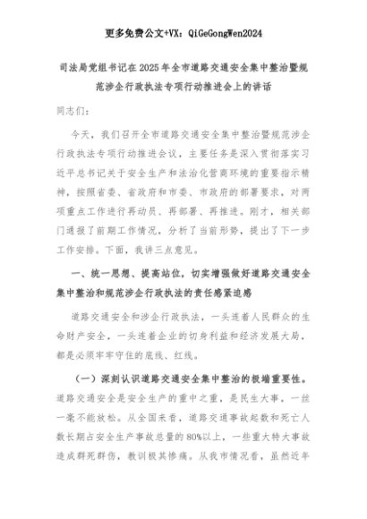 【七哥公文】2025年:【七哥公文】司法局党组书记在2025年全市道路交通安全集中整治暨规范涉企行政执法专项行动推进会上的讲话+更多免费公文+VX:QiGeGongWen2024+更多免费公文+VX:QiGeGongWen2024