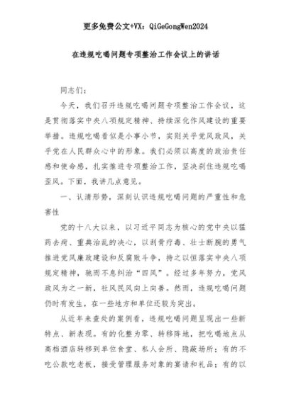 【七哥公文】2025年:【七哥公文】在违规吃喝问题专项整治工作会议上的讲话+更多免费公文+VX:QiGeGongWen2024+更多免费公文+VX:QiGeGongWen2024