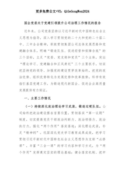 【七哥公文】2025年:【七哥公文】国企党委关于党建引领提升公司治理工作情况的报告+更多免费公文+VX:QiGeGongWen2024+更多免费公文+VX:QiGeGongWen2024