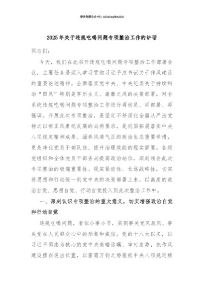 【七哥公文】2025年:【七哥公文】2025年关于违规吃喝问题专项整治工作的讲话+更多免费公文+VX:QiGeGongWen2024+更多免费公文+VX:QiGeGongWen2024