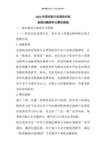 【七哥公文】2025年:【七哥公文】2025年国有银行党委组织部查摆问题清单及整改措施_副本+更多免费公文+VX:QiGeGongWen2024+更多免费公文+VX:QiGeGongWen2024
