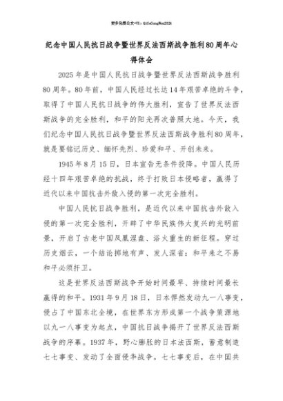 【七哥公文】2025年:【七哥公文】纪念中国人民抗日战争暨世界反法西斯战争胜利80周年心得体会3+更多免费公文+VX:QiGeGongWen2024+更多免费公文+VX:QiGeGongWen2024