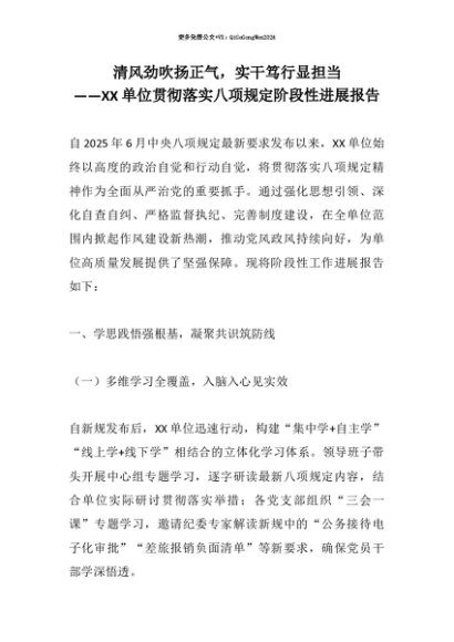 【七哥公文】2025年:【七哥公文】清风劲吹扬正气,实干笃行显担当——XX单位贯彻落实八项规定阶段性进展报告_副本+更多免费公文+VX:QiGeGongWen2024+更多免费公文+VX:QiGeGongWen2024