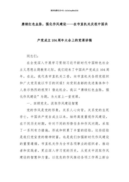 【七哥公文】2025年:【七哥公文】赓续红色血脉,强化作风建设——在市直机关庆祝中国共产党成立104周年大会上的党课讲稿+更多免费公文+VX:QiGeGongWen2024+更多免费公文+VX:QiGeGongWen2024