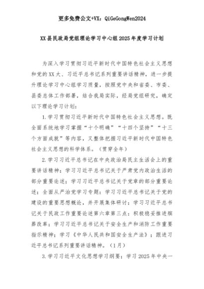 【七哥公文】2025年:【七哥公文】XX县民政局党组理论学习中心组2025年度学习计划+更多免费公文+VX:QiGeGongWen2024+更多免费公文+VX:QiGeGongWen2024