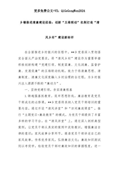 【七哥公文】2025年:【七哥公文】乡镇推进清廉建设经验:创新“五维联动”机制打造“清风乡村”建设新标杆+更多免费公文+VX:QiGeGongWen2024+更多免费公文+VX:QiGeGongWen2024