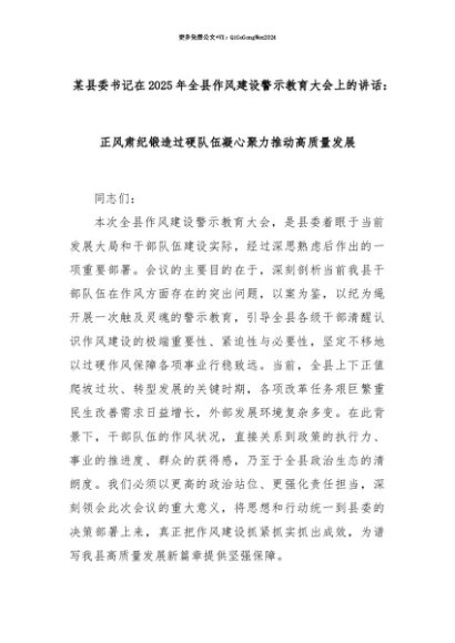 【七哥公文】2025年:【七哥公文】某县委书记在2025年全县作风建设警示教育大会上的讲话:正风肃纪锻造过硬队伍凝心聚力推动高质量发展+更多免费公文+VX:QiGeGongWen2024+更多免费公文+VX:QiGeGongWen2024