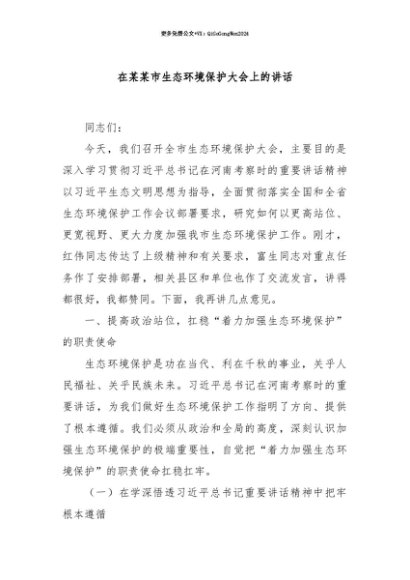 【七哥公文】2025年:【七哥公文】在某某市生态环境保护大会上的讲话+更多免费公文+VX:QiGeGongWen2024+更多免费公文+VX:QiGeGongWen2024