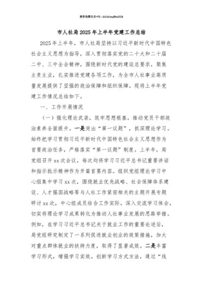 【七哥公文】2025年:【七哥公文】市人社局2025年上半年党建工作总结+更多免费公文+VX:QiGeGongWen2024+更多免费公文+VX:QiGeGongWen2024