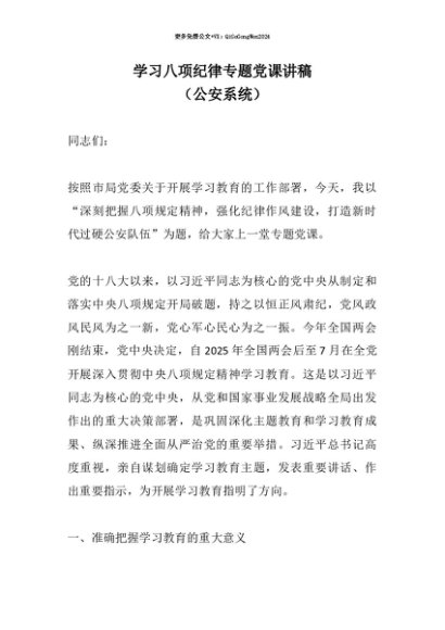 【七哥公文】2025年:【七哥公文】学习八项纪律专题党课讲稿(公安系统)_副本+更多免费公文+VX:QiGeGongWen2024+更多免费公文+VX:QiGeGongWen2024