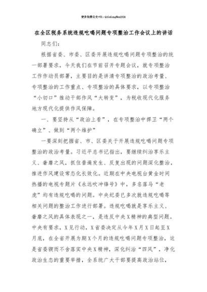 【七哥公文】2025年:【七哥公文】在全区税务系统违规吃喝问题专项整治工作会议上的讲话+更多免费公文+VX:QiGeGongWen2024+更多免费公文+VX:QiGeGongWen2024
