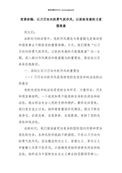 【七哥公文】2025年:【七哥公文】党课讲稿:以刀刃向内的勇气抓作风,以抓铁有痕的力度强根基+更多免费公文+VX:QiGeGongWen2024+更多免费公文+VX:QiGeGongWen2024