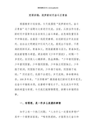 【七哥公文】2025年:【七哥公文】党课讲稿:筑梦新时代奋斗正青春+更多免费公文+VX:QiGeGongWen2024+更多免费公文+VX:QiGeGongWen2024