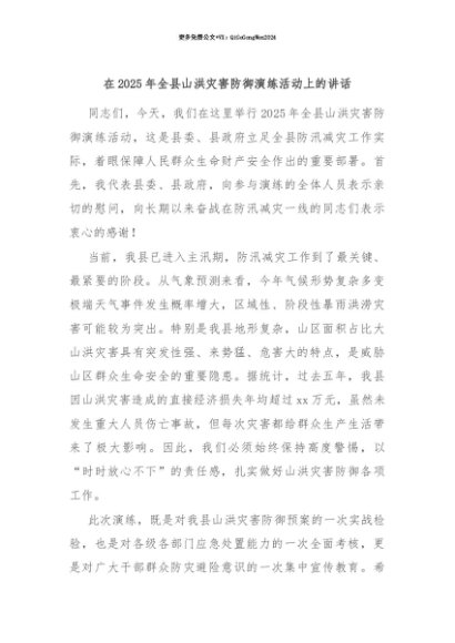 【七哥公文】2025年:【七哥公文】在2025年全县山洪灾害防御演练活动上的讲话+更多免费公文+VX:QiGeGongWen2024+更多免费公文+VX:QiGeGongWen2024