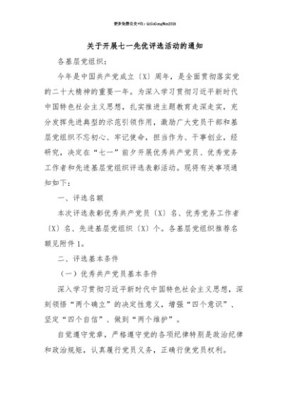【七哥公文】2025年:【七哥公文】关于开展七一先优评选活动的通知+更多免费公文+VX:QiGeGongWen2024+更多免费公文+VX:QiGeGongWen2024