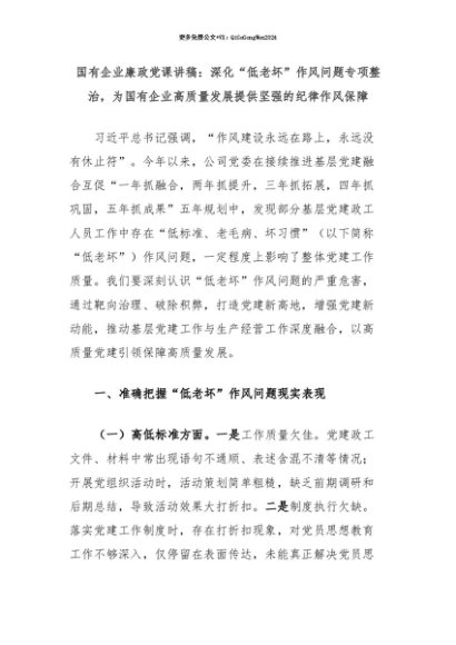 【七哥公文】2025年:【七哥公文】国有企业廉政党课讲稿:深化“低老坏”作风问题专项整治,为国有企业高质量发展提供坚强的纪律作风保障+更多免费公文+VX:QiGeGongWen2024+更多免费公文+VX:QiGeGongWen2024