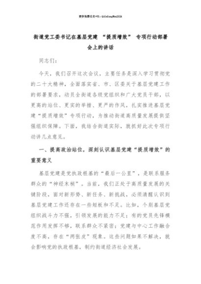 【七哥公文】2025年:【七哥公文】街道党工委书记在基层党建 “提质增效” 专项行动部署会上的讲话+更多免费公文+VX:QiGeGongWen2024+更多免费公文+VX:QiGeGongWen2024
