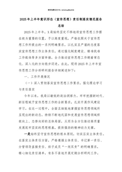 【七哥公文】2025年:【七哥公文】2025年上半年意识形态(宣传思想)责任制落实情况报告总结+更多免费公文+VX:QiGeGongWen2024+更多免费公文+VX:QiGeGongWen2024