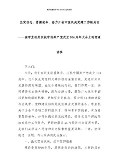【七哥公文】2025年:【七哥公文】坚定信念,勇担使命,奋力开创市直机关党建工作新局面——在市直机关庆祝中国共产党成立104周年大会上的党课讲稿+更多免费公文+VX:QiGeGongWen2024+更多免费公文+VX:QiGeGongWen2024