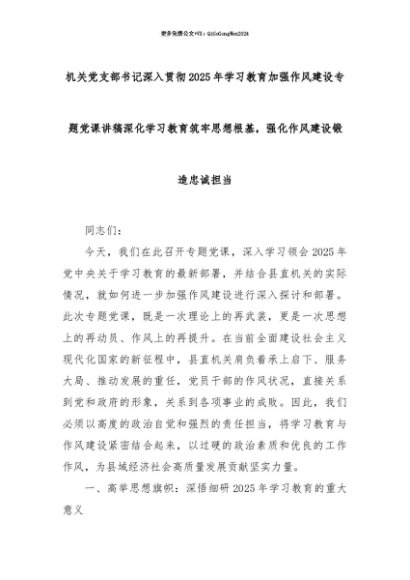 【七哥公文】2025年:【七哥公文】机关党支部书记深入贯彻2025年学习教育加强作风建设专题党课讲稿深化学习教育筑牢思想根基,强化作风建设锻造忠诚担当+更多免费公文+VX:QiGeGongWen2024+更多免费公文+VX:QiGeGongWen2024