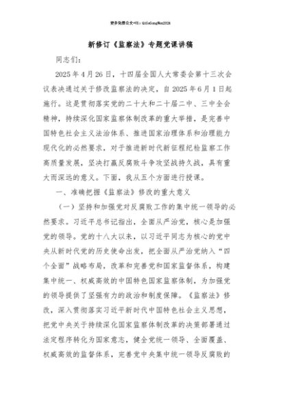 【七哥公文】2025年:【七哥公文】新修订《监察法》专题党课讲稿+更多免费公文+VX:QiGeGongWen2024+更多免费公文+VX:QiGeGongWen2024