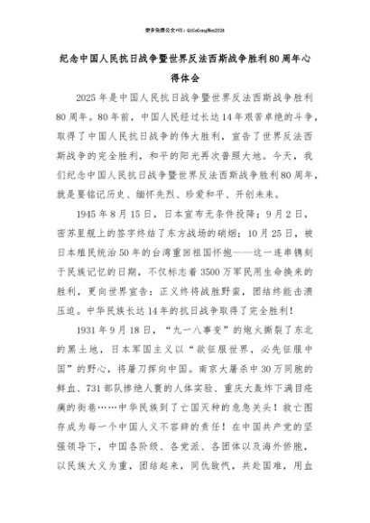 【七哥公文】2025年:【七哥公文】纪念中国人民抗日战争暨世界反法西斯战争胜利80周年心得体会+更多免费公文+VX:QiGeGongWen2024+更多免费公文+VX:QiGeGongWen2024