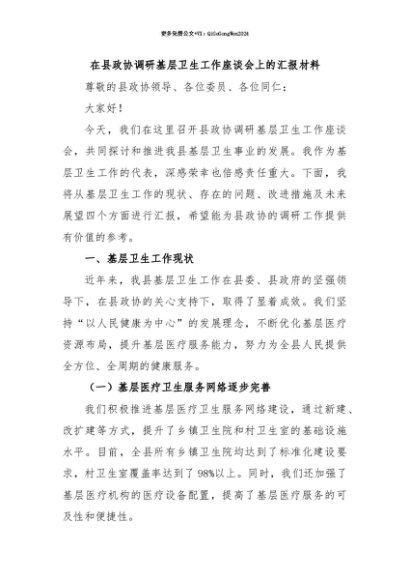 【七哥公文】2025年:【七哥公文】在县政协调研基层卫生工作座谈会上的汇报材料+更多免费公文+VX:QiGeGongWen2024+更多免费公文+VX:QiGeGongWen2024