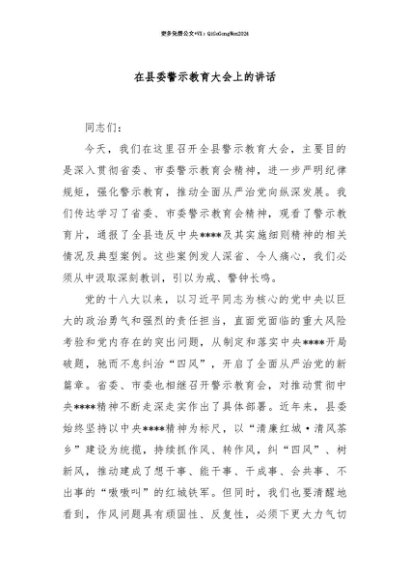 【七哥公文】2025年:【七哥公文】在县委警示教育大会上的讲话+更多免费公文+VX:QiGeGongWen2024+更多免费公文+VX:QiGeGongWen2024
