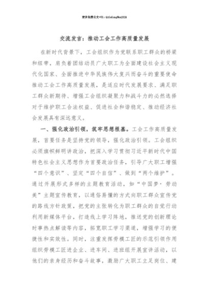 【七哥公文】2025年:【七哥公文】交流发言:推动工会工作高质量发展+更多免费公文+VX:QiGeGongWen2024+更多免费公文+VX:QiGeGongWen2024
