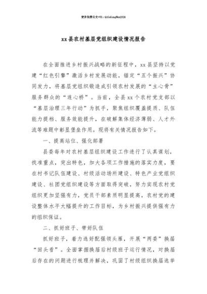 【七哥公文】2025年:【七哥公文】xx县农村基层党组织建设情况报告+更多免费公文+VX:QiGeGongWen2024+更多免费公文+VX:QiGeGongWen2024