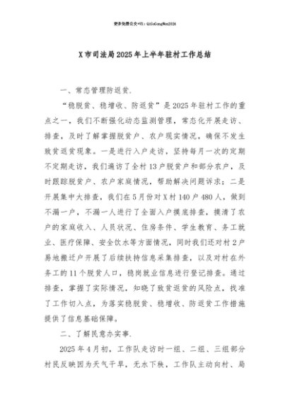 【七哥公文】2025年:【七哥公文】X市司法局2025年上半年驻村工作总结+更多免费公文+VX:QiGeGongWen2024+更多免费公文+VX:QiGeGongWen2024