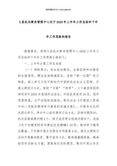【七哥公文】2025年:【七哥公文】X县机关事务管理中心关于2025年上半年工作总结和下半年工作思路的报告+更多免费公文+VX:QiGeGongWen2024+更多免费公文+VX:QiGeGongWen2024