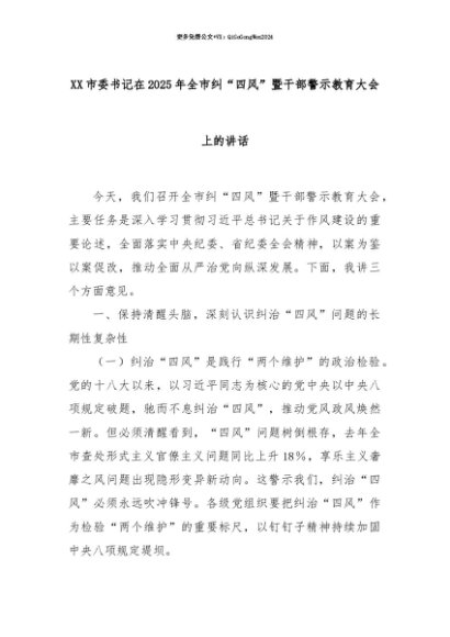 【七哥公文】2025年:【七哥公文】XX市委书记在2025年全市纠“四风”暨干部警示教育大会上的讲话+更多免费公文+VX:QiGeGongWen2024+更多免费公文+VX:QiGeGongWen2024