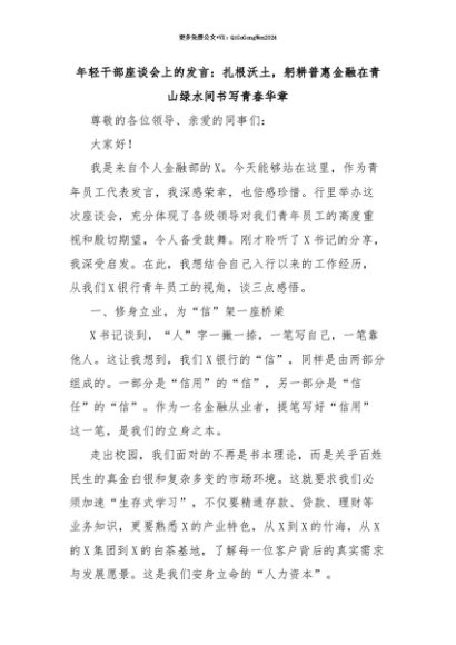 【七哥公文】2025年:【七哥公文】年轻干部座谈会上的发言:扎根沃土,躬耕普惠金融在青山绿水间书写青春华章+更多免费公文+VX:QiGeGongWen2024+更多免费公文+VX:QiGeGongWen2024
