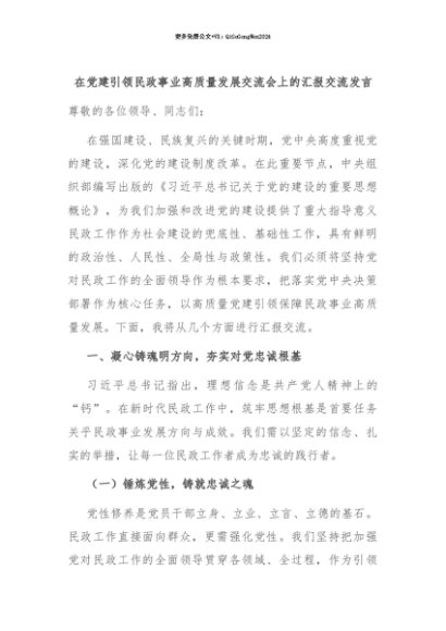 【七哥公文】2025年:【七哥公文】在党建引领民政事业高质量发展交流会上的汇报交流发言+更多免费公文+VX:QiGeGongWen2024+更多免费公文+VX:QiGeGongWen2024
