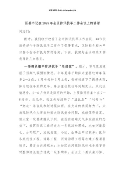 【七哥公文】2025年:【七哥公文】区委书记在2025年全区防汛抗旱工作会议上的讲话+更多免费公文+VX:QiGeGongWen2024+更多免费公文+VX:QiGeGongWen2024