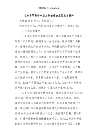 【七哥公文】2025年:【七哥公文】在汽车零部件产业工作推进会上的发言材料+更多免费公文+VX:QiGeGongWen2024+更多免费公文+VX:QiGeGongWen2024