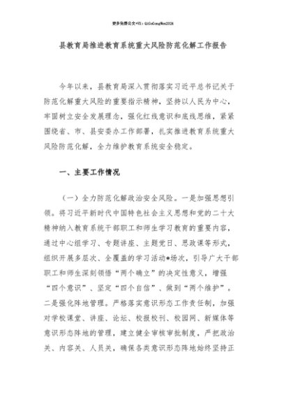 【七哥公文】2025年:【七哥公文】县教育局推进教育系统重大风险防范化解工作报告+更多免费公文+VX:QiGeGongWen2024+更多免费公文+VX:QiGeGongWen2024