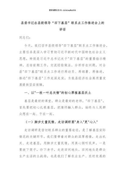 【七哥公文】2025年:【七哥公文】县委书记在县级领导“四下基层”联系点工作推进会上的讲话+更多免费公文+VX:QiGeGongWen2024+更多免费公文+VX:QiGeGongWen2024