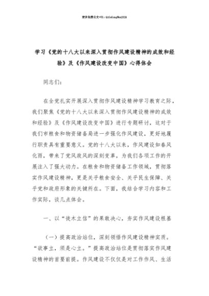 【七哥公文】2025年:【七哥公文】学习《党的十八大以来深入贯彻作风建设精神的成效和经验》及《作风建设改变中国》心得体会(市粮食和物资储备局)+更多免费公文+VX:QiGeGongWen2024+更多免费公文+VX:QiGeGongWen2024