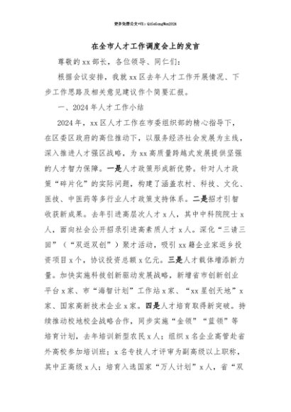 【七哥公文】2025年:【七哥公文】在全市人才工作调度会上的发言+更多免费公文+VX:QiGeGongWen2024+更多免费公文+VX:QiGeGongWen2024