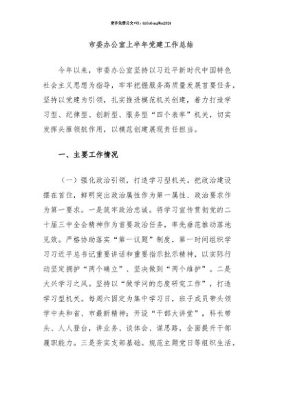 【七哥公文】2025年:【七哥公文】市委办公室上半年党建工作总结+更多免费公文+VX:QiGeGongWen2024+更多免费公文+VX:QiGeGongWen2024