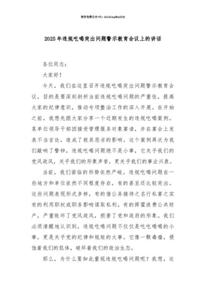 【七哥公文】2025年:【七哥公文】2025年违规吃喝突出问题警示教育会议上的讲话+更多免费公文+VX:QiGeGongWen2024+更多免费公文+VX:QiGeGongWen2024