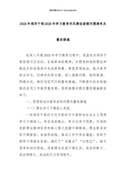 【七哥公文】2025年:【七哥公文】2025年领导干部2025年学习教育作风建设查摆问题清单及整改措施+更多免费公文+VX:QiGeGongWen2024+更多免费公文+VX:QiGeGongWen2024