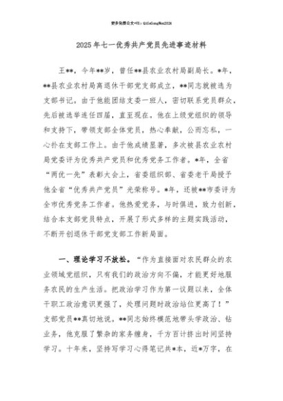 【七哥公文】2025年:【七哥公文】2025年七一优秀共产党员先进事迹材料+更多免费公文+VX:QiGeGongWen2024+更多免费公文+VX:QiGeGongWen2024