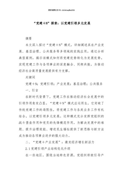【七哥公文】2025年:【七哥公文】“党建+N”探索:以党建引领多元发展+更多免费公文+VX:QiGeGongWen2024+更多免费公文+VX:QiGeGongWen2024