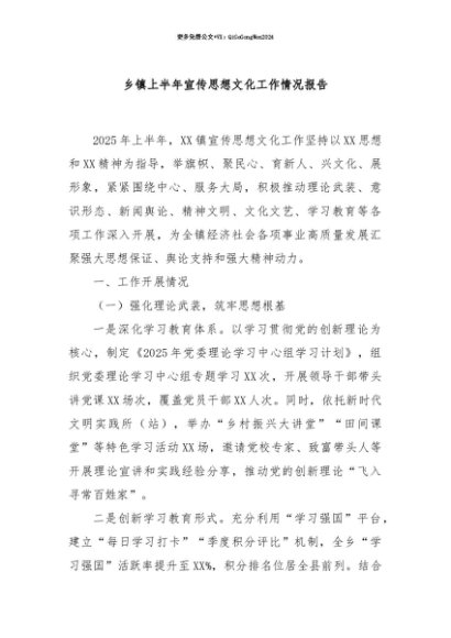 【七哥公文】2025年:【七哥公文】乡镇上半年宣传思想文化工作情况报告+更多免费公文+VX:QiGeGongWen2024+更多免费公文+VX:QiGeGongWen2024